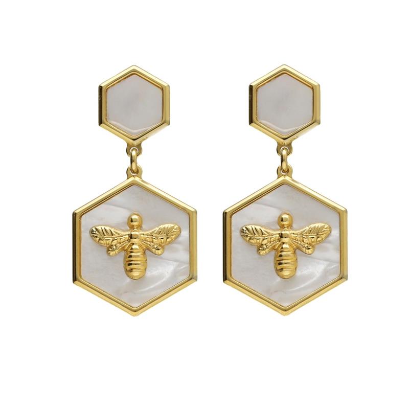 Pendientes Largos Victoria Cruz para mujer de la colección Honey fabricados en plata bañada en oro amarillo formados por 2 hexágonos con fondo nacarado, uno de ellos con una abjea. Su cierre es de presión.