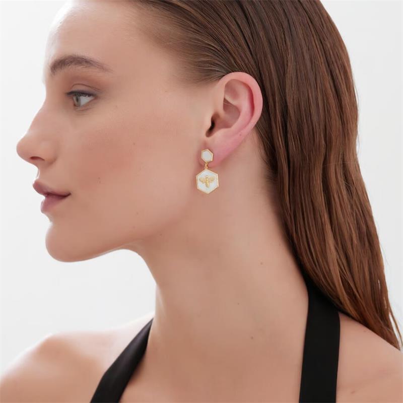 Pendientes Largos Víctoria Cruz Doble Hexágono y Abeja Plata Baño Oro y Nácar A4868-29DT