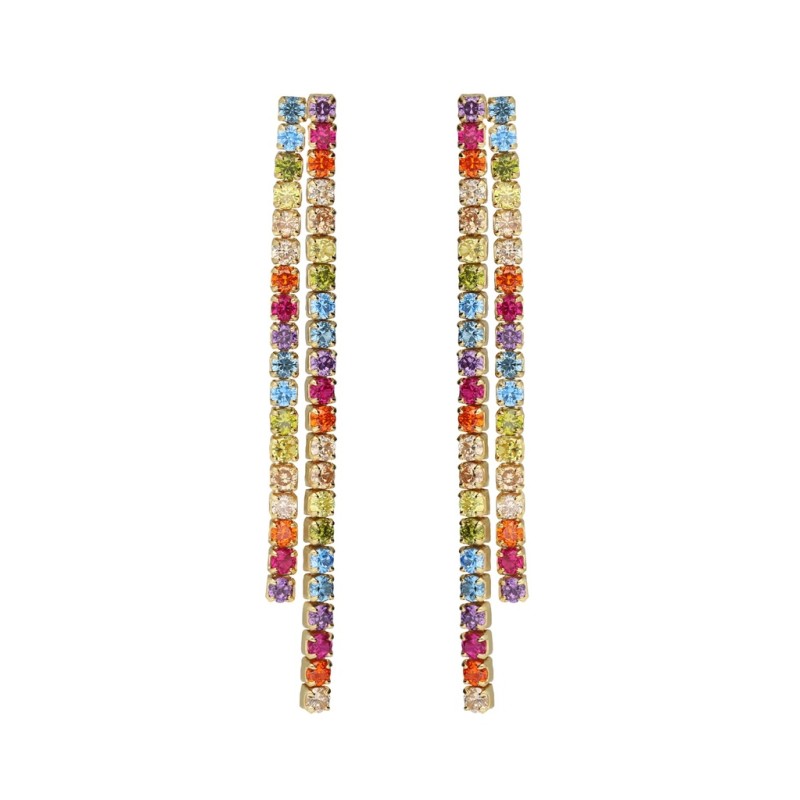 Pendientes Victoria Cruz para mujer de diseño largo fabricado en plata bañada en oro amarilo de tipo riviere compuestos por una doble hilera de cristales multicolor. Su cierre es de presión.