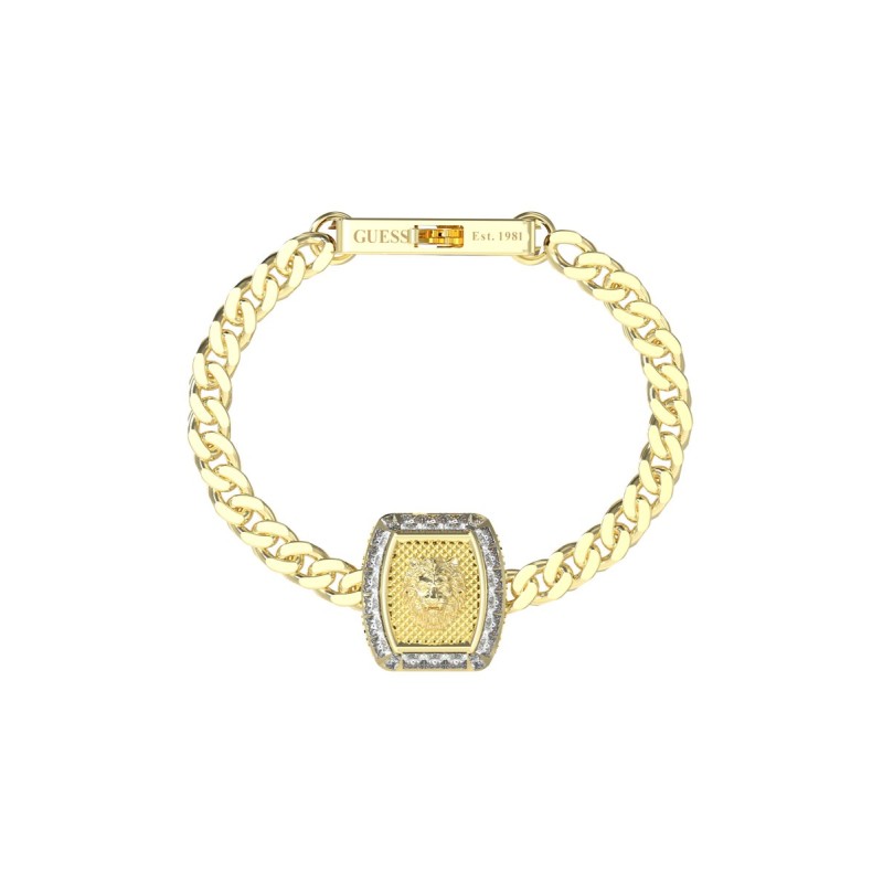 Pulsera Guess para hombre de la colección Lion King fabricada en acero bañado en oro amarillo compuesta por cadena de atractivos eslabones que dan lugar a una pieza central rectangular con la cabeza de un león rodeada de cristales blancos.