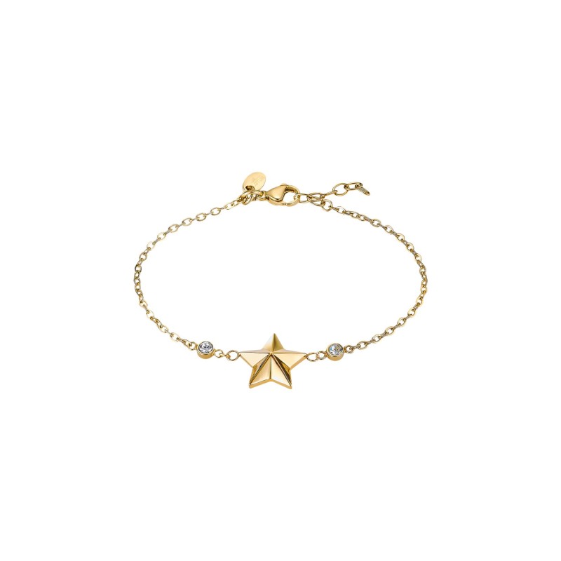 Pulsera Lotus Style para mujer fabricada en acero bañado en oro amarillo compuesta por una elegante cadena que da lugar a una estrella colgante y cristales brillantes. Su cierre es de mosquetón.