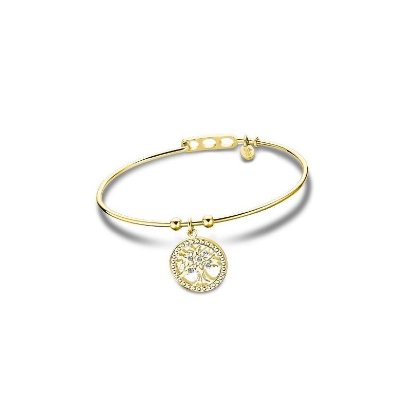 Pulsera Lotus Style Millenial para mujer fabricada en acero inoxidable con un radiante baño dorado, esta pulsera rígida destaca por su adorno central en forma de árbol de la vida el cual contiene circonitas transparentes, al igual que la circunferencia que le rodea. Llena de simbología tu muñeca con esta original pulsera.