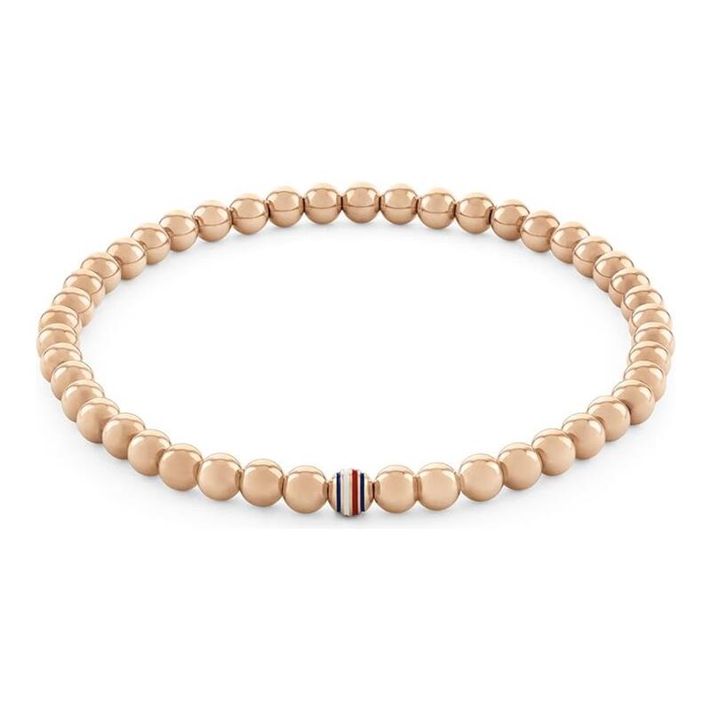 Pulsera Tommy Hilfiger para mujer fabricada en acero inoxidable bañado en oro rosado compuesta por atractivas bolas con una bola central con los colores de la bandera Tommy Hilfiger. Su nucleo es elástico.