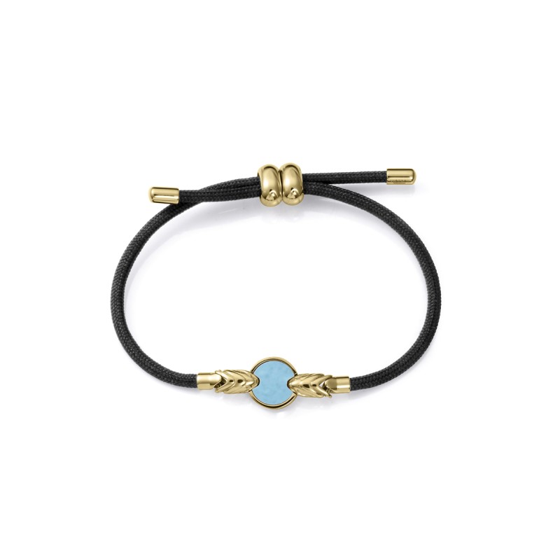 Pulsera Viceroy Fashion para mujer compuesta por cordón negro que da lugar a una pieza central en acero bañado en oro amarillo con una piedra Madre Perla. Su cierre es deslizante ajustable a la medida de tu muñeca.