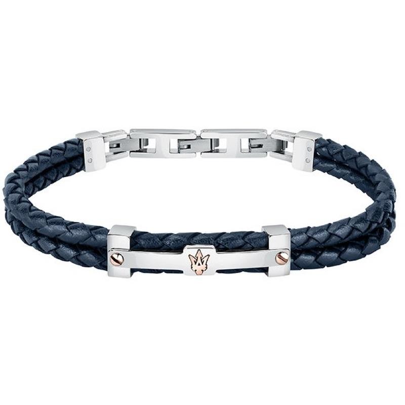Pulsera Maserati para hombre compuesta por doble pulsera de piel trenzada en color azul unida en su parte central por una pieza en acero inoxidable con el logotipo Maserati en rosado. Su cierre es de enganche en acero inoxidable.