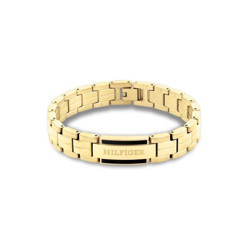 Pulsera Tommy Hilfiger para hombre fabricada en acero inoxidable bañado en oro amarillo 18kt compuesta por atractivos eslabones que dan lugar en su parte central a una placa rectangular con el logotipo "Hilfiger". Su cierre es desplegable.