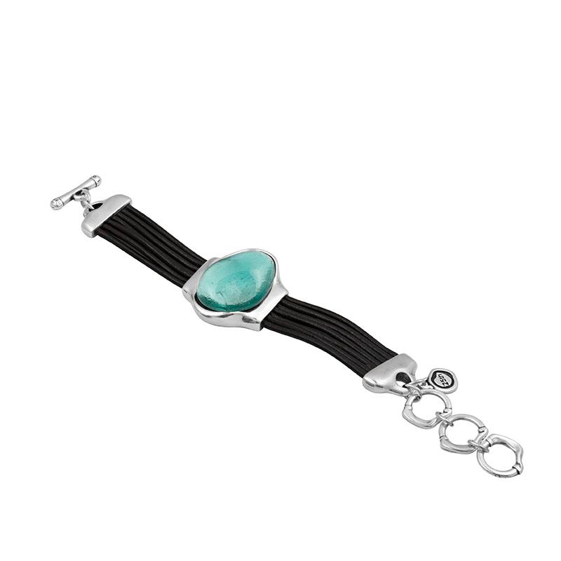 Pulsera Ciclón para mujer modelo Vega de la colección 25th Colors compuesta por tiras de cuero negro y piezas en metal hipoalergénico bañado en plata con un cristal de murano verde en su parte central. Su cierre es en T.