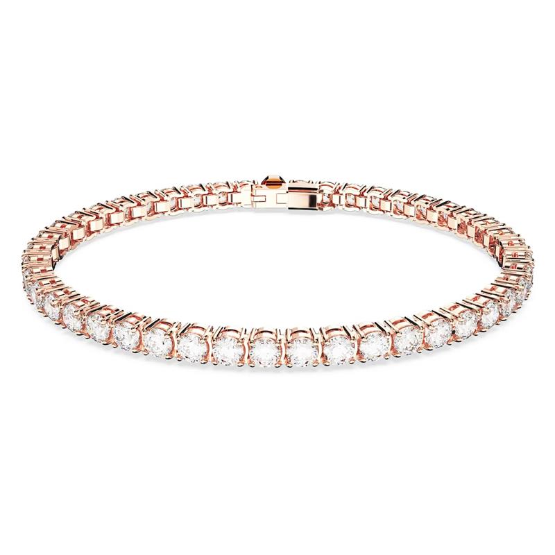 Pulsera Swarovski para mujer de la colección Matrix Tennis fabricada en aleación de metales bañados en oro rosa compuesta por cristales blancos en talla brillante engastados cada uno de ellos en 4 garras. Su cierre es de lengüeta con broche de seguridad.