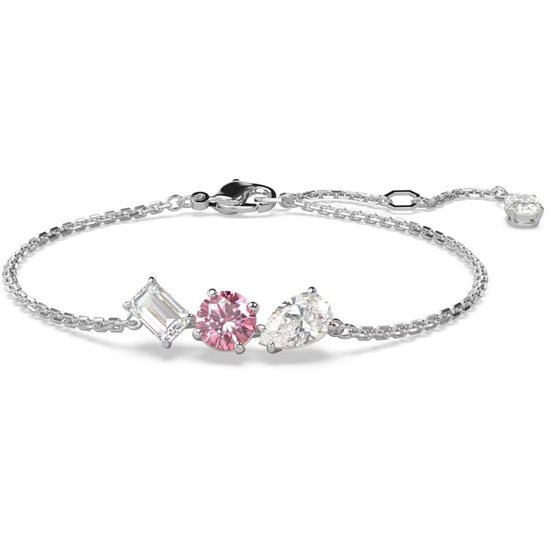 Pulsera Swarovski para mujer de la colección Mesmera fabricada en aleación de metales bañados en rodio compuesta por una atractiva cadena que da lugar en su parte central a 2 cristales blancos en talla de lábrima y rectangular y un cristal cuadrado en color rosa en su parte central. Su cierre es de mosquetón ajustable mediante cadena extensible.