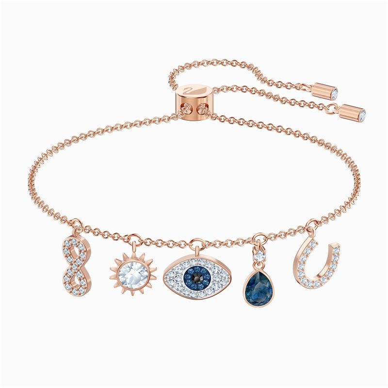 Pulsera Swarovski Symbolic multicolor. Este diseño incorpora varios símbolos, entre los que se incluyen una herradura de la suerte, un nudo del infinito y un ojo turco. Lleno de significados protectores, brilla en una diversidad de tonos y de engastes de cristal. Una pieza con baño en tono de oro rosa que seguro que aportará un toque de estilo a tu look, tanto de día como de noche.