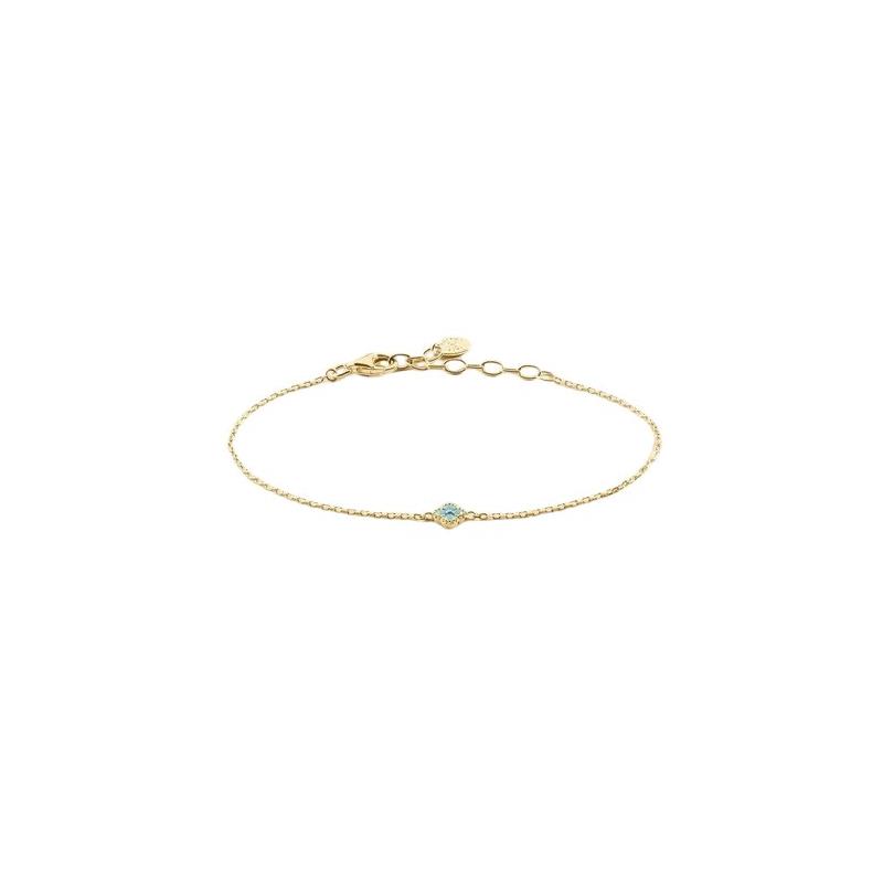 Pulsera Agatha Paris para mujer de la colección Beloved fabricada en plata bañada en oro amarillo de 18Kt compuesta por una fina y elegante cadena que da lugar a un abalorio central en forma de florecita compuesta por circonitas en color turquesa. Su cierre es de mosquetón ajustable mediante cadena extensible.