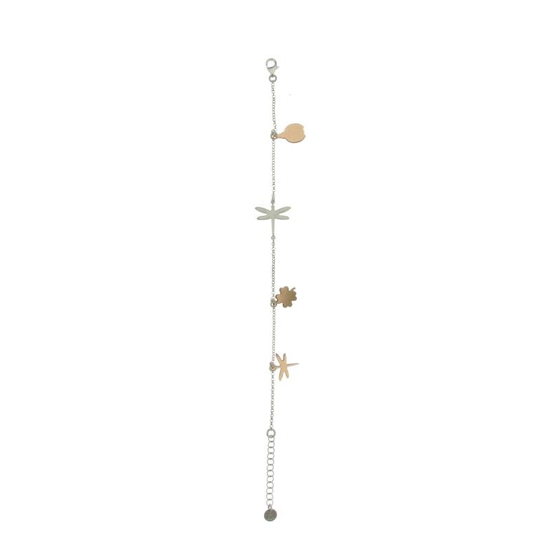 Pulsera de plata bicolor con abalorios a modo de colgantes que combina el plateado y el color rose. Una joya de verano y muy divertida gracias a libélulas, trébol y mariposas que convierten tus looks más casual en chic y sofisticados.