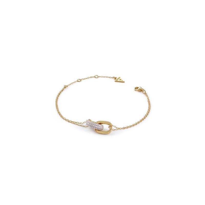 Pulsera Guess para mujer de la colección Zapestnica fabricada en plata bañada en oro amarillo compuesta por una fina y elegante cadena que contiene en su parte central 2 eslabones entrelazados uno de ellos liso y otro formado por circonitas blancas. Su cierre es de mosquetón ajustable mediante cadena extensible.