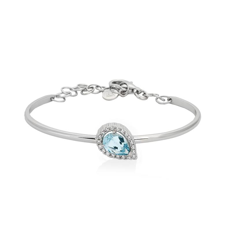 Pulsera Marina García para mujer de la colección AguaMarina ideal para novia fabricada por un brazalete rígido con una pieza en su parte central en forma de lágrima compuesta por una AguaMarina y rodeada por circonitas blancas. Su cierre es de mosquetón ajustable.