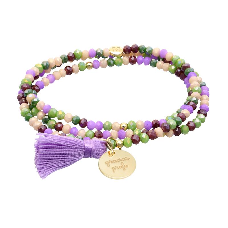 Pulsera Marina García para mujer de la colección Zen Provenza fabricada en plata bañada en oro amarillo de 18kt compuesta por cristales Strass facetados multicolor con una chapa circular colgante con el grabado "Gracias Profe". Esta pulsera de diseño elástico puede ser utilizada como tobillera y gargantilla.