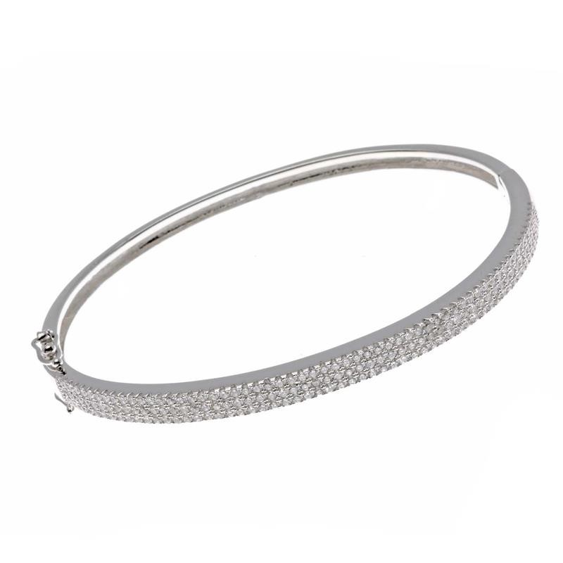 Pulsera Salvatore para mujer fabricada en plata de primera ley con baño de rodio. Se trata de una pulsera de caña tipo brazalete, rígida formada a lo largo de su longitud por 3 filas paralelas de micro circonitas blancas que dan elegancia y brillo a esta pieza.