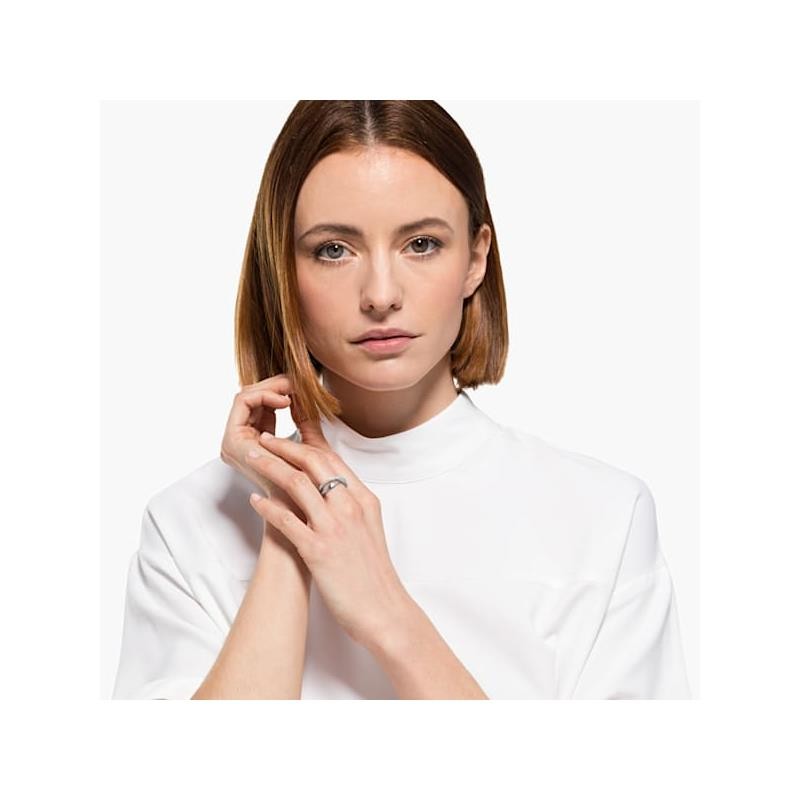 Anillo Swarovski para mujer de la colección Twist Rows fabricado en baño de rodio con cristales blancos. Estamos ante un anillo con máxima elegancia y originalidad debido a su diseño que entrelaza una hilera compuesta por cristales blancos de menor a mayor tamaño con una hilera bañada en rodio, cuya combinación hará llevar a tus looks a la excelencia.