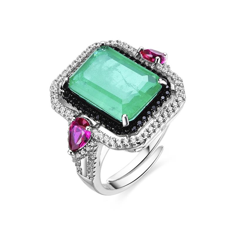 Anillo Luxenter para mujer modelo Malizu fabricado en plata bañada en rodio compuesto en su parte superior por una piedra de cuarzo hidrotermal en color verde rodeada de mini circonitas blancas en talla brillante con 2 circonitas en color fucsia en forma de gota.