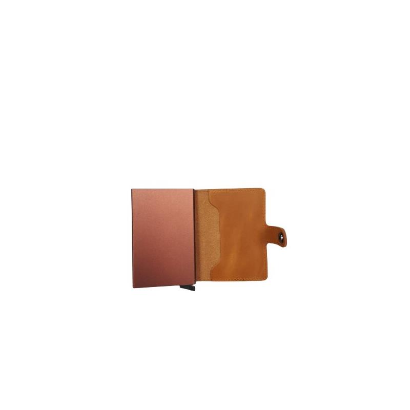 Tarjetero para hombre fabricado en piel envejecida en color cuero con pespunte en color cuero con cierre mediante botón a presión. En su interior podemos en contrar un tarjetero metálico en color dorado donde llevar tus tarjetas más importantes y poder sacarlas con facilidad y con la mayor seguridad posible.